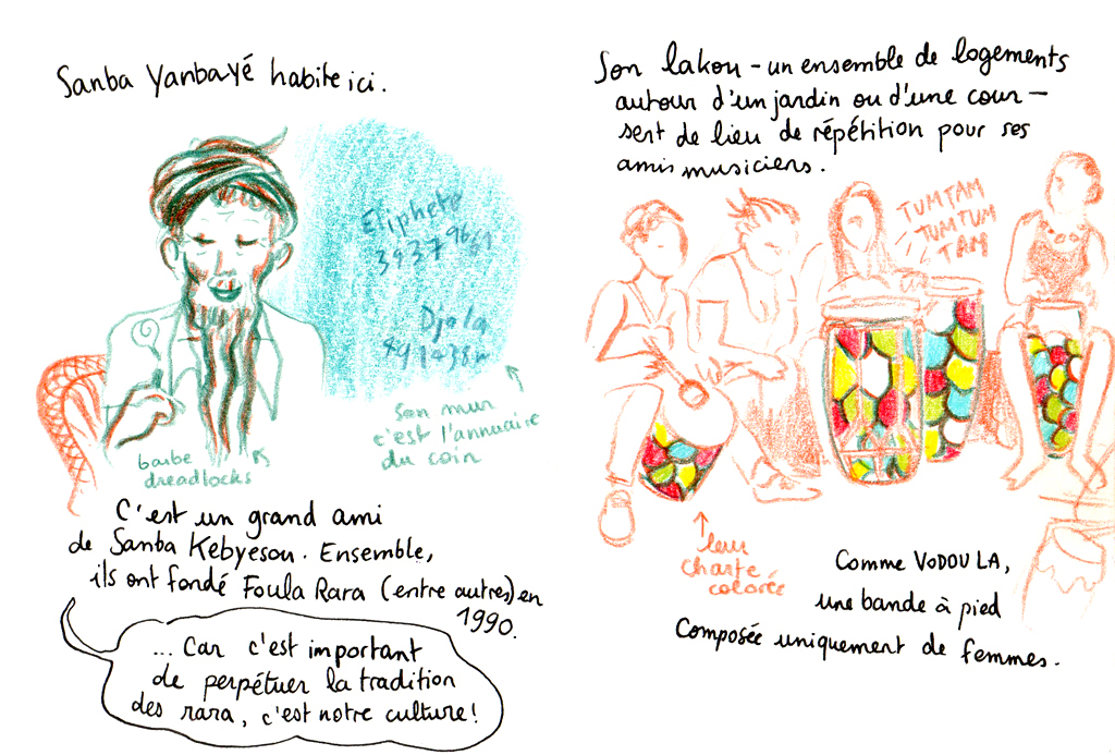 Plusieurs rafistolages de maracas plus tard, je m’efforce de repousser les assauts répétés d’un rasta au stade intermédiaire de la défonce (pas méchant, mais très insistant); ohlàlà, et en plus je baragouine créole, alors il ne me lâche plus. Il s’est mis en tête de me “protéger”. Je zigzague en rythme entre les gens pour essayer de le semer. À côté, Marion, forte de ses nouvelles connaissances en argot, envoie bouler un vieux papi rasta qui lui scandait: