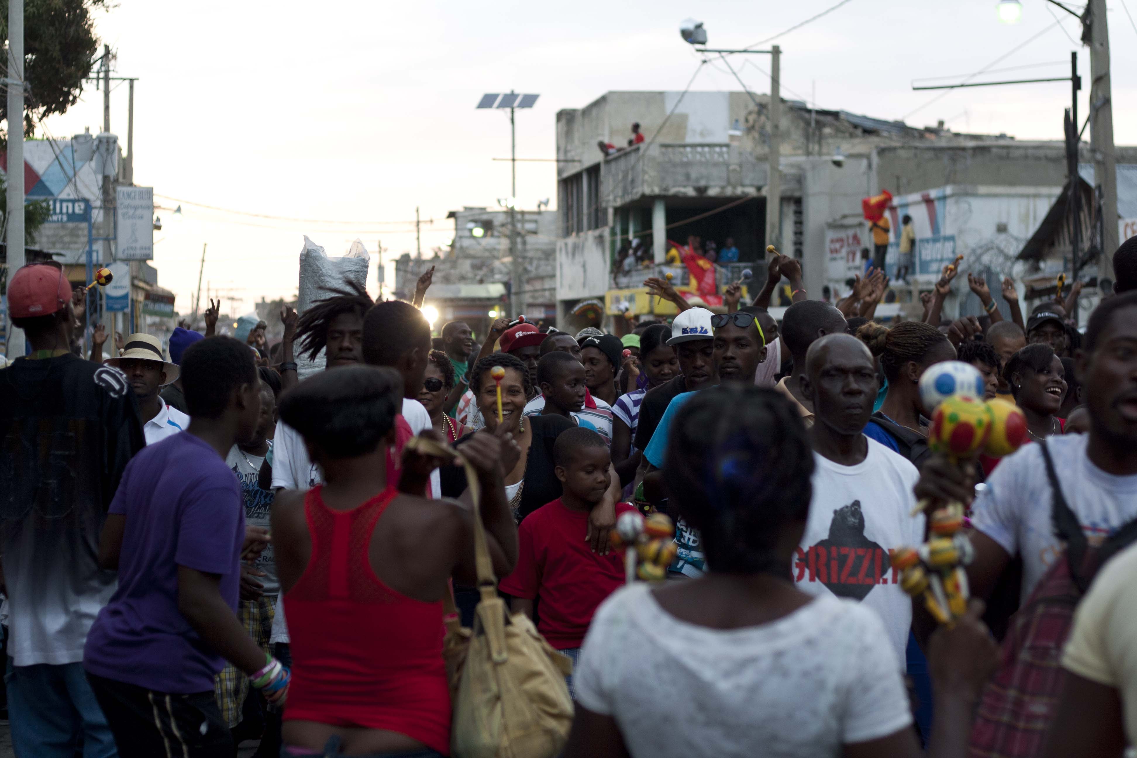 On fait flamber le petit tas mystique au rhum : c’est parti, la bande sort de la base en fanfare dans un tourbillon de poussière et de cendres qui donne une ambiance visuelle très goudou-goudou. Après une autre flambée de rhum au carrefour Place Brouard, et un feu plus important au rond-point d’après (autour duquel la bande effectue un tour en trottant), elle rejoint à bonne cadence le parcours carnavalesque, qui débute à partir du stade Silvio Cator, et serpente dans les rues d’anba-lavil. Ce sont des quartiers particulièrement détruits par le séisme, mais les gens sont là, dans la foule et en haut des ruines, pour assister au défilé.